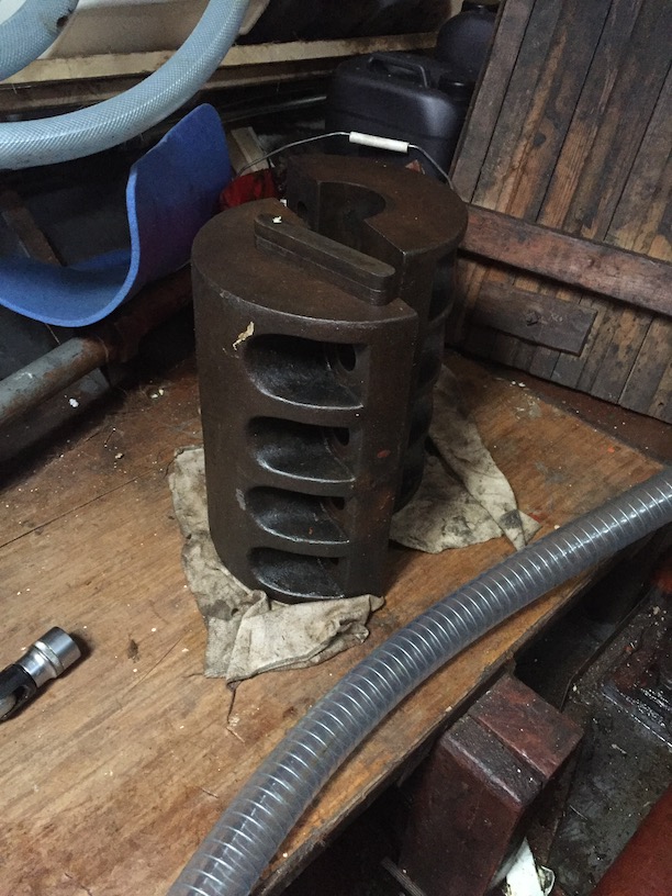 Kaksi läpivientiä tehtiin uusiksi, tai tarkkaan ottaen toinen on täysin uusi ja tulee myöhemmin generaattorin käyttöön. Toinen taas oli tarkoitus alun perin laittaa septi- ja harmaavesien hätätyhjennystä varten lähemmäs ahteria, mutta viime hetkellä päätimmekin että ko. läpivientiä ei laiteta lainkaan, mutta sen sijaan läpiviennin osat päädyttiin hyödyntämään pääkoneen raakaveden tuloveden aukkoa varten. Vanhan läpiviennin irroitettuamme totesimmekin tämän hyväksi ideaksi. Vaikka raakavesiputkisto ja -venttiilit on 2” kokoluokkaa, vanha pronssinen läpivienti oli pienimmästä kohdasta hädin tuskin tuuman kokoinen halkaisijaltaan. Varsinaisista läpivientien rakenteista sekä itse valmistetuista teräslaipoista kirjoitellaan oma artikkeli, päivitän tähän linkin ko. tekstiin kunhan sellainen julkaistaan. Nämäkin teräslevyt ovat 12mm mustaa rautaa ja hitsattu kiinni kummaltakin puolelta.