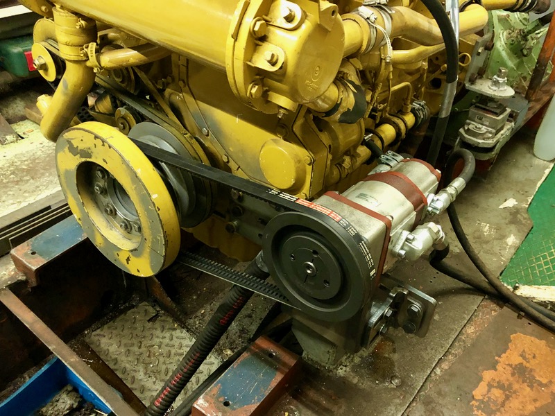 Kuten aiemmissa kirjoituksissa käsiteltiinkin jo, pumppujen veto on kytketty pääkoneen kampiakselilta tukilaakerin avustamana kiilahihnoilla. Hihnaveto on kestänyt hyvin pienemmän pumpun kuorman, mutta täyttä 250 barin painetta systeemi ei kestä, vaan hihnat luistavat. Paineenrajoitusventtiliä säätämällä totesimme, että n. 160 bar on maksimi, mitä hihnaveto kestää. Tällöinkin systeemi on liian riskialtis jatkuvaan käyttöön. Sinänsä ei mikään ihme, tehontarve on minimissäänkin 12-15kW luokkaa.